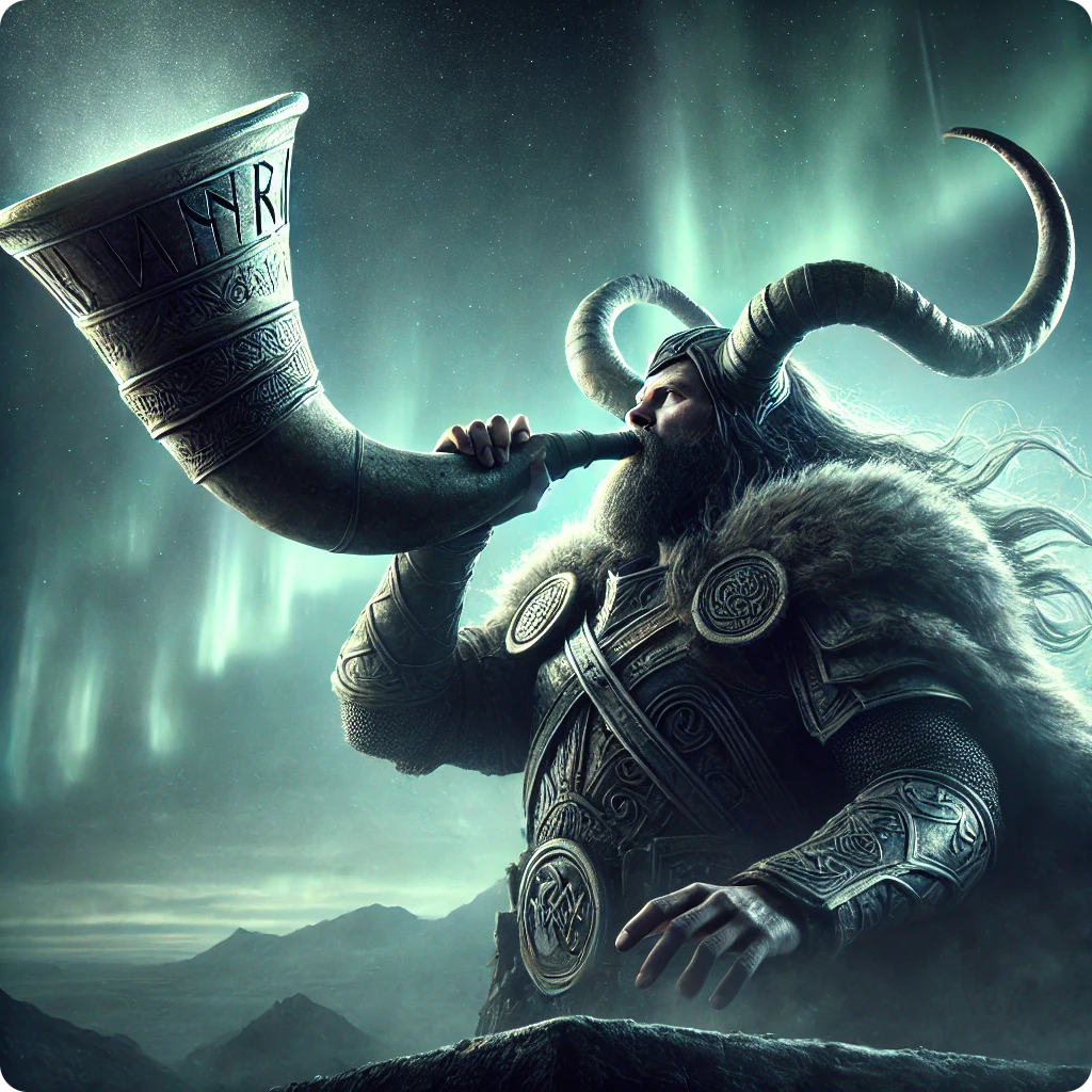Gästen. Dort wohnt er in einer Halle namens Himinbjörg. Er hat ein Schwert und das Signalhorn Gjallar, das oft auch