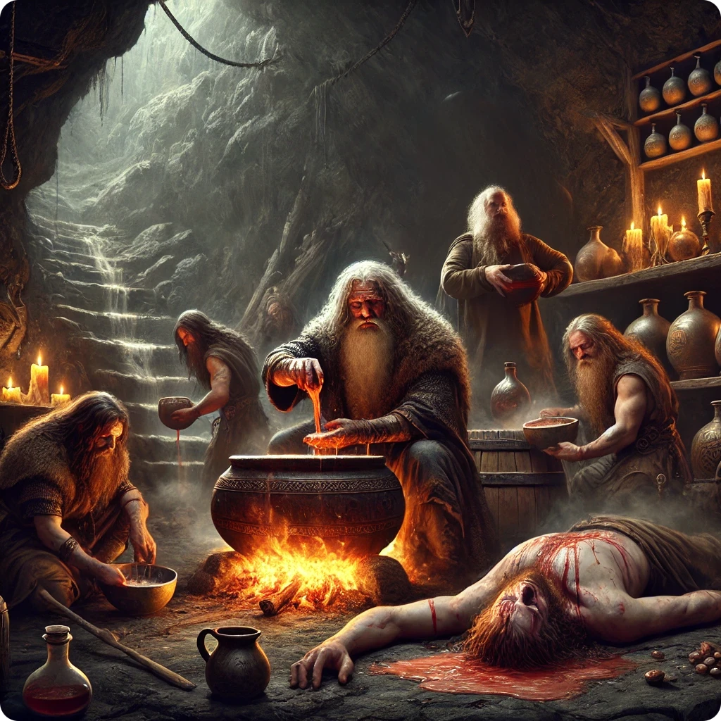ließen sie liegen, aber sein wertvolles Blut fingen sie auf und nahmen es mit. In Svartalfheim
