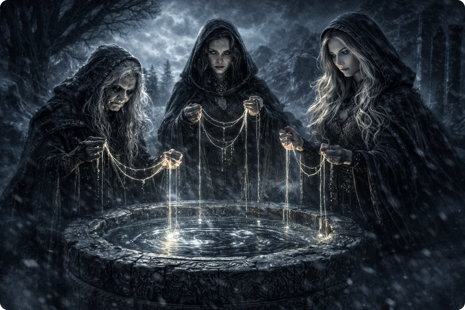 Die Nornen sind das Schicksal. Sie stehen für den Dualismus von Gutem und Bösem. Es sind drei an der Zahl und sie hören auf Urd,