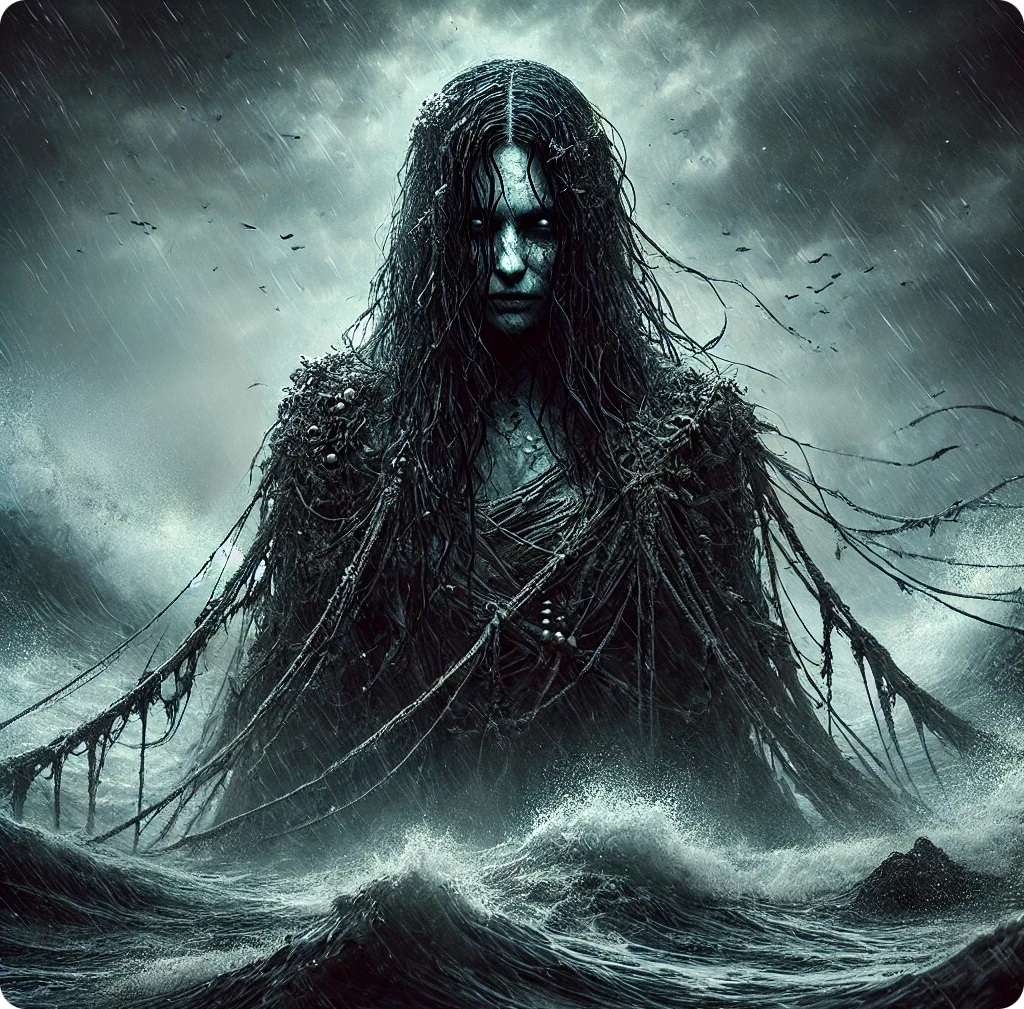 Pendant zu ihrem Mann und verkörpert die aufgepeitschte See und die Gefahren, die in den Ozeanen