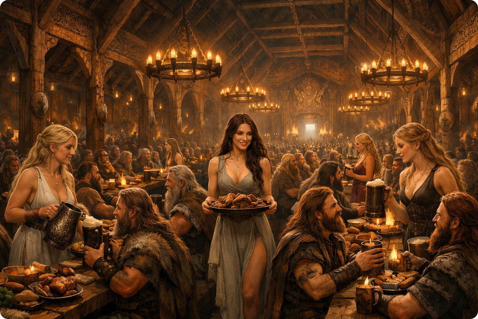 kämpfen, wobei sie jeden Abend wieder lebendig werden, um das anschließende Festmahl, bei dem sie von den