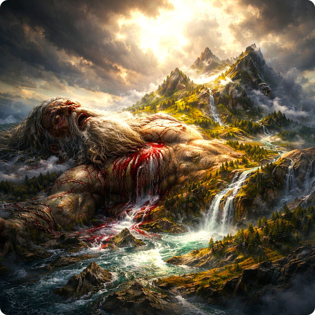 Die Erde wurde aus seinem Fleisch gestaltet, aus Knochen wurden die Berge, aus Zähnen die Felsen. Bäume entstanden aus Ymirs Haaren,