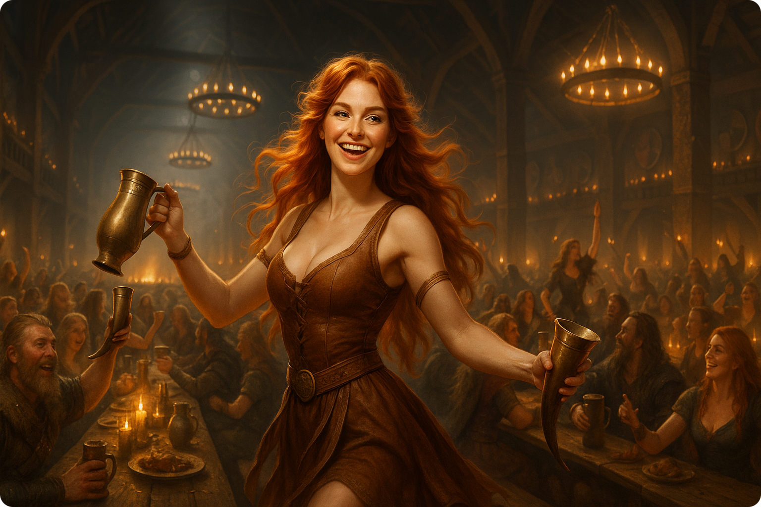 kämpfen, wobei sie jeden Abend wieder lebendig werden, um das anschließende Festmahl, bei dem sie von den